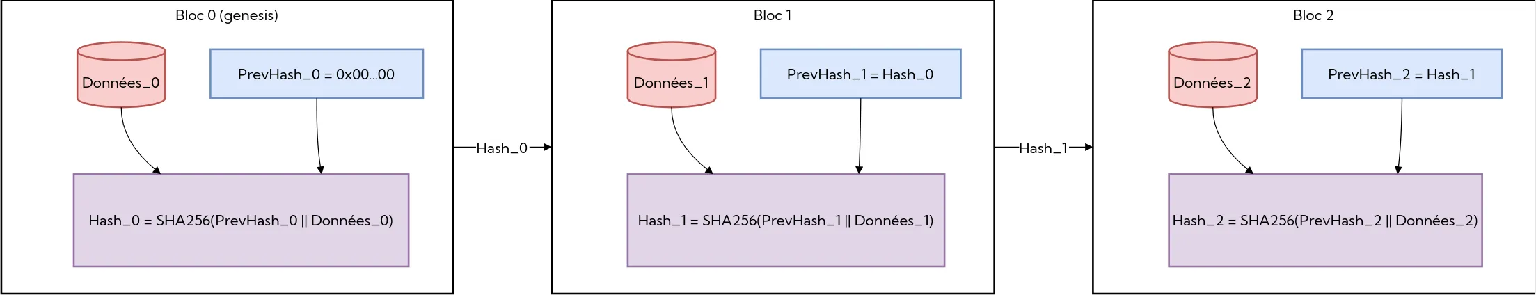 Une chaîne de hachage est simplement une liste de blocs de données, où chaque bloc est haché sur la concaténation du checksum du bloc précédent et de ses propres données (SHA-256 ou BLAKE3 par exemple). (en utilisant