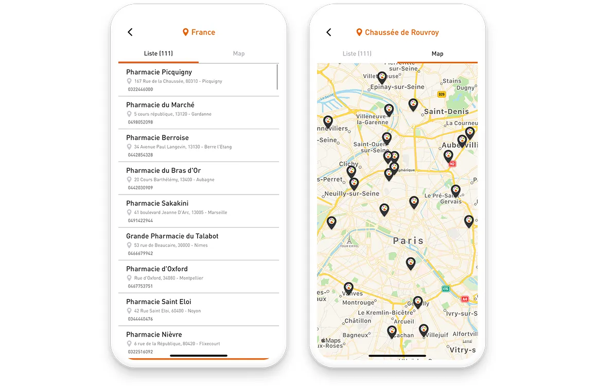 L'utilisateur peut activer sa géolocalisation et choisir une pharmacie à proximité.