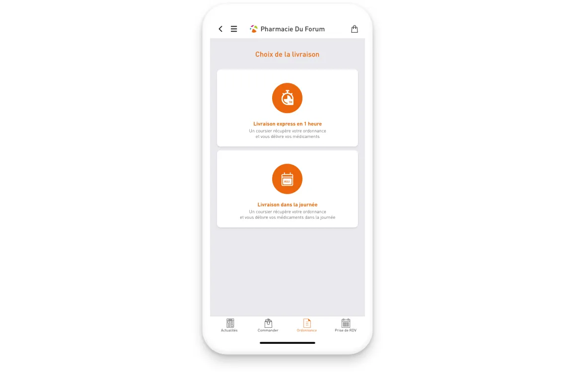 L’utilisateur peut également choisir de se faire livrer sa commande à domicile, dans l'heure ou dans la journée, en réglant sa commande sur l’application. Le livreur passe récupérer l’ordonnance à son domicile et lui livre ses médicaments.