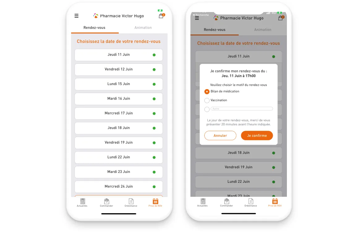 L'utilisateur a la possibilité de prendre rendez-vous avec son pharmacien depuis l'application, que ce soit pour une vaccination, un bilan de médication ou un autre motif. Comme sur Doctolib, les disponibilités du pharmacien sont accessibles et l'utilisateur peut prendre rendez-vous en précisant le motif de la visite.