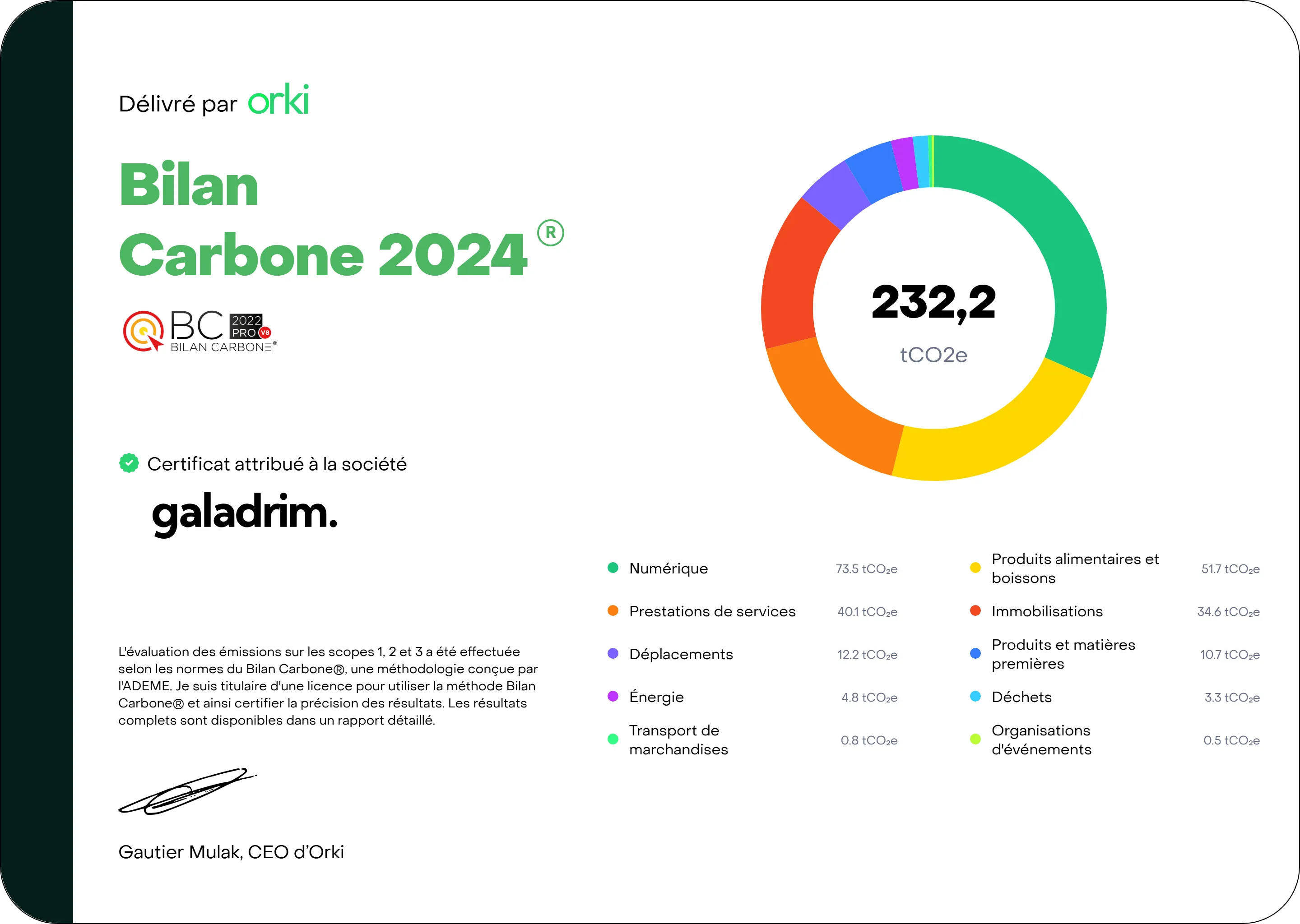 Orki, dont l'ambition est de permettre à toutes les entreprises de réaliser simplement leur bilan carbone. Orki a été fondé par des anciens Galadrimeurs et fait partie du groupe Galadrim. Le SaaS d'Orki nous a permis de calculer nos émissions grâce à 3 sources de données :