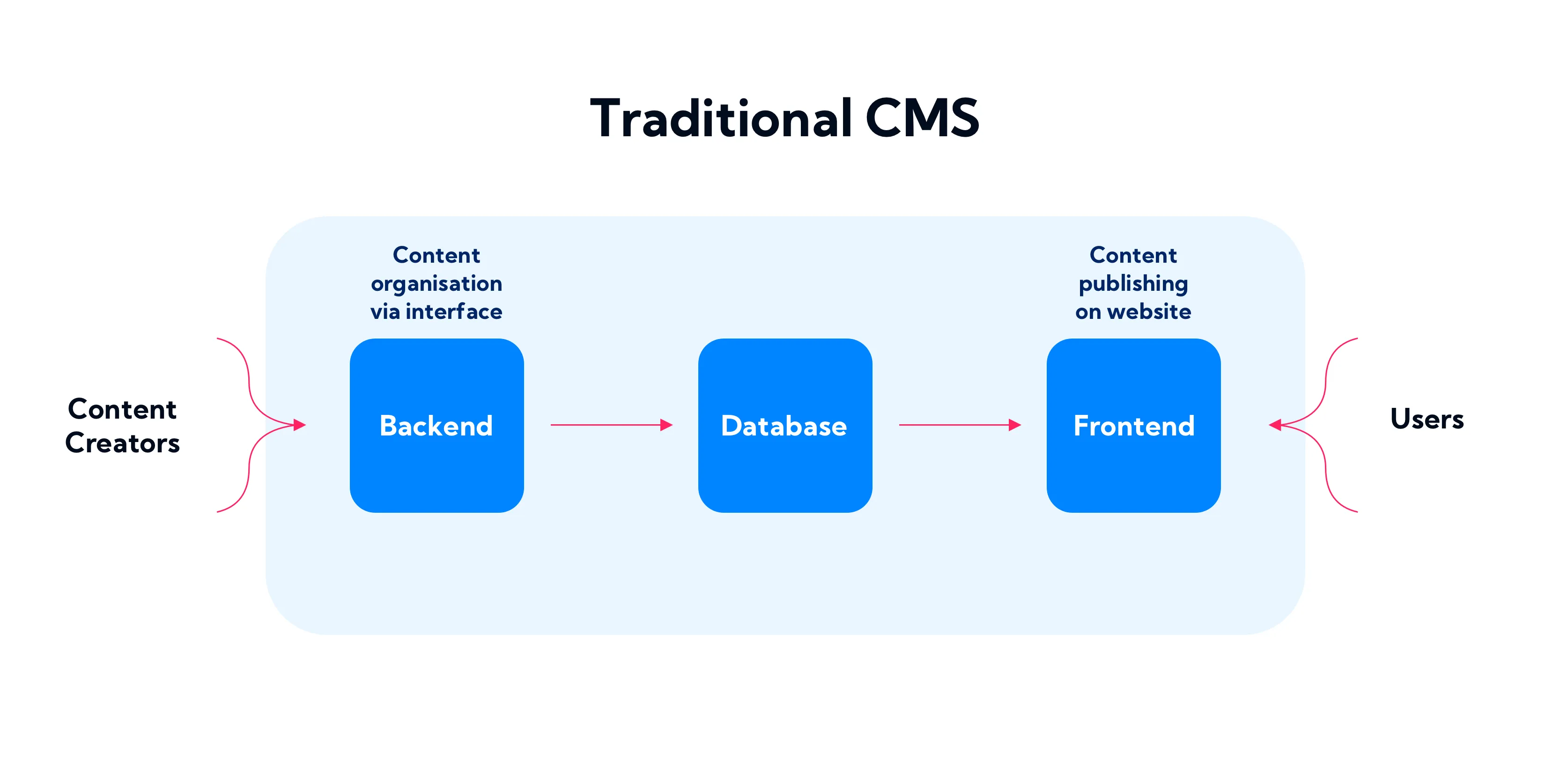 Dans un CMS traditionnel (qu’on appelle aussi CMS couplé), le back-office et le front-office sont directement liés. Prenons l’exemple de WordPress : sur l'interface d'administration, les utilisateurs utilisent des outils d’édition pour créer et modifier leur contenu. Ils l’enregistrent dans une base de données principale. Le contenu est ensuite pris en charge par le système de template qui l'affiche sur le site (en front). Cela signifie que vous êtes restreint aux spécifications et possibilités limitées qu’offre le CMS notamment pour le choix du langage de programmation (PHP pour WordPress).